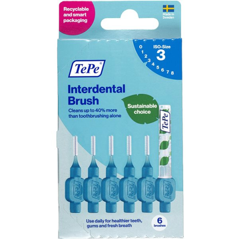 Fogköztisztító kefe - kompakt, ISO méret 3 (1,1 - 1,2 mm), alkalmas 0,6 - 2,2 mm méretű fogközökhöz, drót átmérője 0,6 mm, sörték átmérője 0,9 mm, hagyományos szálak, kék kivitel, 6 darabos csomag A TEPE MK Original 0,6 mm-es fogköztisztító kefék hatékony tisztítást biztosítanak a fogközökben, ahová a hagyományos fogkefe nem ér el. A klasszikus sörtéknek és a műanyag bevonatú fémdrótnak köszönh