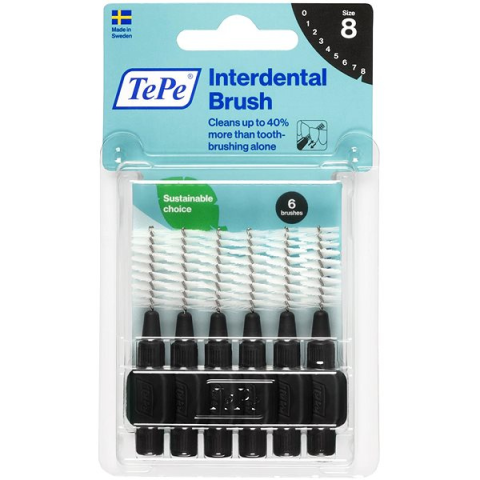 Fogköztisztító kefe - kompakt, ISO méret 7 (2,4 mm felett), alkalmas 1,5 - 5 mm méretű fogközökhöz, drót átmérője 1,5 mm fekete kivitel, 6 darabos csomag Az új, környezetbarát TEPE fogköztisztító kefék ideális választást jelentenek azok számára, akik környezetkímélő módon szeretnének gondoskodni fogaikról. A megújuló forrásból származó anyagoknak, az i
