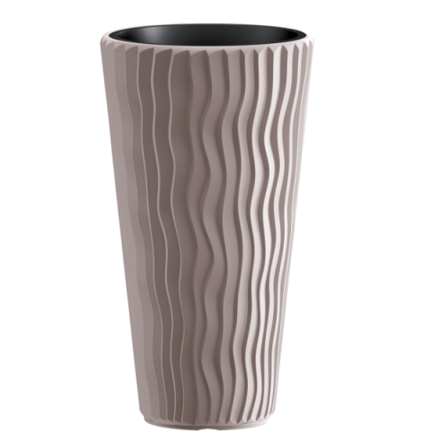 Magas virágcserép, térfogata 37 l, hullámos textúrájú kialakítás, kül- és beltérre egyaránt alkalmas, praktikus betétet tartalmaz a növények ültetéséhez, méretei 34,9 x 62 x 34,97 cm, mokka színű. Tedd beltéri vagy kültéri növényeidet a Prosperplast SA