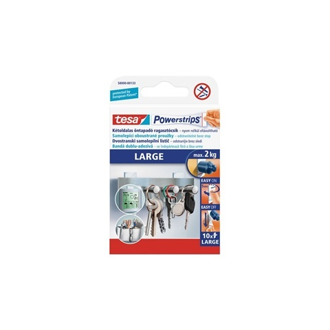 A tesa Powerstrips nagy ragasztócsíkokat a legfeljebb 2 kg súlyú lapos tárgyak eltávolítható rögzítésére terveztük. Lehetővé teszi a sérülésmentes felakasztást anélkül, hogy lyukakat fúrna a falba. További előnye, hogy lehetővé teszi, hogy bármikor levegye a tárgyat anélkül, hogy látható nyomot hagyna. Ezeket a tesa Powerstrips Large csíkokat bármilyen sík és kellően kemény falfelületen használhatja. Tökéletes a kellően nagy és sík rögzítési felül
