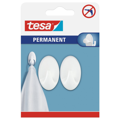 A tesa fehér, ovális tartós akasztó praktikus fürdőszobai kellék törölközők, mosdókesztyűk és bármilyen egyéb testápolási kellék felakasztásához. Ideális a konyhába is olyan könnyű eszközök felakasztására, amelyeket szeretne a keze ügyében tartani. Megbízható öntapadó hátoldalának köszönhetően tartósan rögzíthetők szinte bármilyen falon. Gyorsan rögzítheti sima felületeken, például csempén, üvegen, fán, műanyagon és egyéb anyagokon, anélk
