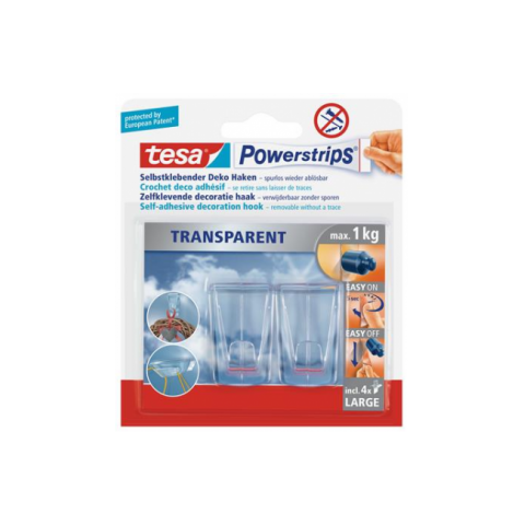 A tesa Powerstrips® átlátszó nagy Deco akasztó fúrás nélküli felakasztásra készült. Öntapadó és eltávolítható akasztó bármilyen legfeljebb 1 kg súlyú tárgyhoz.