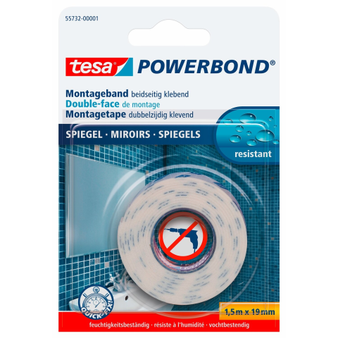 A tesa Powerbond tükörragasztó szalag kiemelkedő tapadóerővel rendelkezik, még nedves helyeken, például fürdőszobákban is. Képes megtartani akár 70 cm x 70 cm-es, legfeljebb 4 mm vastagságú tükröket. Mivel nincs szükség szögekre vagy csavarokra, ez a kétoldalas szalag megbízhatóan rögzíti a fürdőszobai vagy fali tükröket anélkül, hogy a csempe sérülése miatt kellene aggódni.