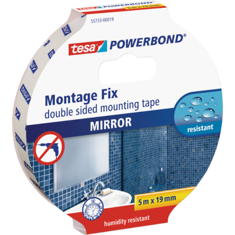 A tesa Powerbond tükörragasztó szalag kiemelkedő tapadóerővel rendelkezik, még nedves helyeken, például fürdőszobákban is. Képes megtartani akár 70 x 70 cm-es, legfeljebb 4 mm vastagságú tükröket*. Mivel nincs szükség szögekre vagy csavarokra, ez a kétoldalas szalag megbízhatóan rögzíti a fürdőszobai vagy fali tükröket anélkül, hogy a csempe sérülése miatt kellene aggódni. *Lapos, max. 4 mm vastagságú tárgyakhoz és a legtöbb sima, megfelelően szilárd f