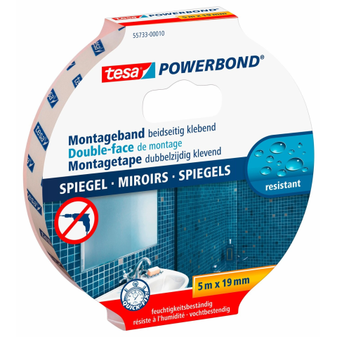 A tesa Powerbond tükörragasztó szalag kiemelkedő tapadóerővel rendelkezik, még nedves helyeken, például fürdőszobákban is. Képes megtartani akár 70 cm x 70 cm-es, legfeljebb 4 mm vastagságú tükröket. Mivel nincs szükség szögekre vagy csavarokra, ez a kétoldalas szalag megbízhatóan rögzíti a fürdőszobai vagy fali tükröket anélkül, hogy a csempe sérülése miatt kellene aggódni.