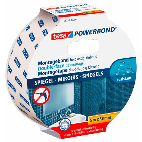 A tesa Powerbond tükörragasztó szalag kiemelkedő tapadóerővel rendelkezik, még nedves helyeken, például fürdőszobákban is. Képes megtartani akár 70 cm x 70 cm-es, legfeljebb 4 mm vastagságú tükröket. Mivel nincs szükség szögekre vagy csavarokra, ez a kétoldalas szalag megbízhatóan rögzíti a fürdőszobai vagy fali tükröket anélkül, hogy a csempe sérülése miatt kellene aggódni.