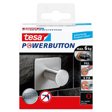 A tesa Powerbutton Classic szögletes akasztó csiszolt rozsdamentes acélból készült, erős akasztó, amely képes 6 kg súly megtartására is. Szabadalmazott tesa Powerbutton technológiájának köszönhetően könnyen rögzíthető anélkül, hogy lyukak fúrására vagy bármilyen szerszám használatára volna szükség. Az akasztó speciális kötőanyagot használ, amely vízálló és hőálló. Az akasztó erős ragasztást garantál a legtöbb kemény felületen, például csempé