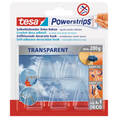 A tesa Powerstrips átlátszó Deco akasztók ideálisak könnyű dekorációkhoz (max. 200 g), eltávolíthatóak, újra felhasználhatóak.
