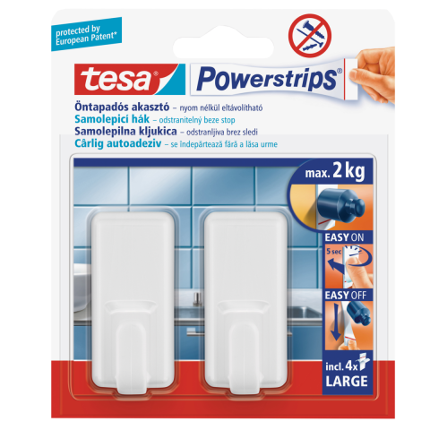 Időtlen dizájnjával a tesa Powerstrips nagy Klasszikus akasztó illik bármilyen modern fürdőszobába vagy konyhába. Ügy készült, hogy megtartson akár 2 kg-os súlyt is. Szögek használata és lyukak fúrása helyett egyszerűen ragassza fel bármilyen sima és kemény felületre*. Emellett eltávolítható akasztónak is terveztük, bármikor levehető anélkül, hogy nyomot hagyna. A tartalék Powerstrips nagy ragasztócsík használatával akár újra is használhatja bárhol az ot