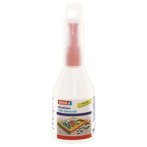 A tesa univerzális ragasztó minden iroda vagy otthon kötelező kelléke. -rendkívül sokoldalú ragasztó -ideális kézműveskedéshez -papír, karton és fa ragasztásához tervezték -ideális sok más tipikus háztartási anyag, például bőr, textil, kerámia, üveg és sokféle műanyag ragasztásához is -használja hobby barkácsoláshoz, vagy javításokhoz -speciális kupak lehetővé teszi a ragasztó precíz felvitelét és könnyű eloszlatását is -rendkívül öregedésáll