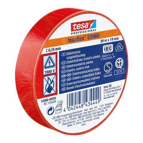 Szigetelőszalag, 19 mm x 20 m, TESA "Professional", piros - TE53948P - Rögzítő- és ragasztóanyagok - A tesa® Elektromos szigetelőszalag egy speciális összetételű, önkioltó plasztifikált PVC-szalag. Ideális huzalok és kábelek szigetelésére, maszkolásra, kö