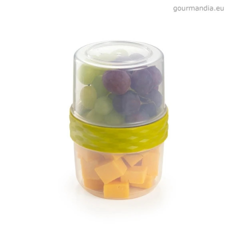 Kétrészes tárolóedény mérőskálával, csavaros, szilikonos tömítéssel ellátott kupakkal Kiválóan alkalmas élelmiszerek elkülönített tárolására, biztonságos szállítására és higiénikus tálalására. Ellenálló műanyagból készült. Anyaga: műanyag, szilikon M