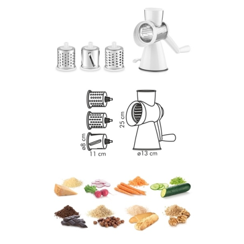 A Tescoma Handy Univerzális konyhai reszelő-aprító kiváló minőségű rozsdamentes acélból, és tartós műanyagból készült. A cserélhető, rendkívül éles és ellenálló rozsdamentes acél pengéi alkalmassá teszik sajtok, diófélék, csokoládé, zöldségek, gyümölcsök finom és durva reszelésére, szeletelésére, valamint julienne típusú zöldségcsíkok, és zsemlemorzsa készítésére.