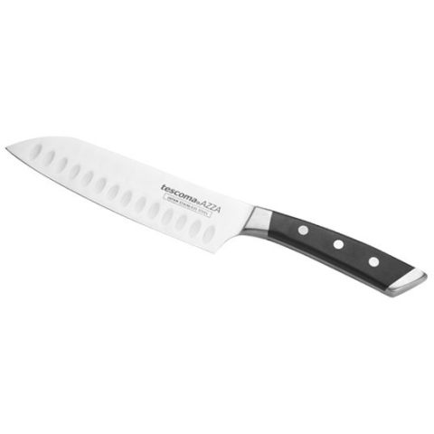 Konyhakés - acél, penge hossza 14 cm, santoku kés, acél markolat, markolat anyaga acél A TESCOMA Azza Santoku egy rendkívül profi kés az élelmiszerek problémamentes, könnyű és gyors szeleteléséhez és darabolásához. A kétoldalas bemélyedéseknek megakadályozzok az ételek pengé