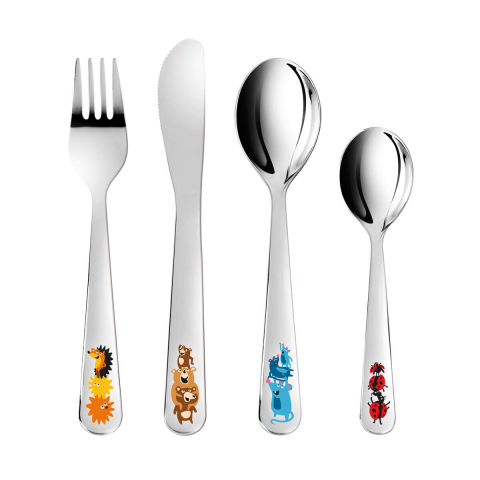 Gyermek étkészlet, 3 éves kortól ajánlott. Első osztályú rozsdamentes acélból készült, mosogatógépben is moshat