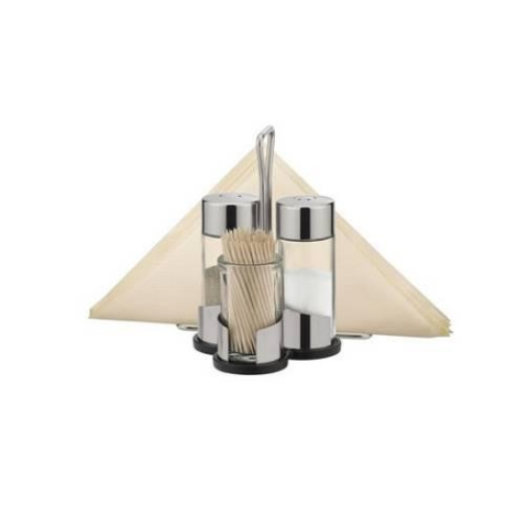 Só-bors-fogvájó (fogpiszkáló)-és szalvétatartó egyben. Otthoni és professzionális felhasználásra (vendéglátóipar) egyaránt alkalmas. Anyaga: rozsdamentes acél, ellenálló műanyag és üveg.