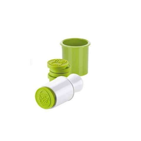 Keksznyomó vagy kekszpecsét hagyományos húsvéti mintákkal. Házilag díszíthetünk vele kekszeket és a mézeskalácsot. A készlet 6 különféle nyomatú pecsétet tartalmaz, melyek könnyedén cserélhetőek. Egy kör alakú vágó is tartozik hozzá, mely tökéletesen a pecsétek méretéhez illeszkedik. A nyomóminták a nyomóházban tárolhatók. Anyaga erős műanyag és szilikon, mosogatógépben tisztítható. Alap keksz recepthez hozzávalók: 350 g liszt, 150 g kristálycukor