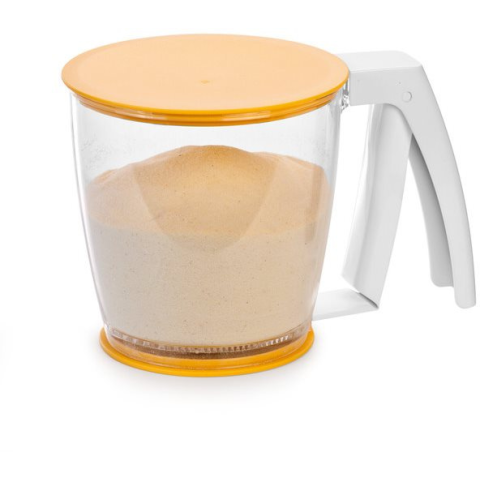 Szita - kézi, gyors szitálásra kiválóan alkalmas, ellenálló műanyagból készült The TESCOMA DELÍCIA mechanical sieve is an excellent helper for sifting flour, powdered sugar and other loose raw materials . It is equipped with a mechanism, the control of which is located i