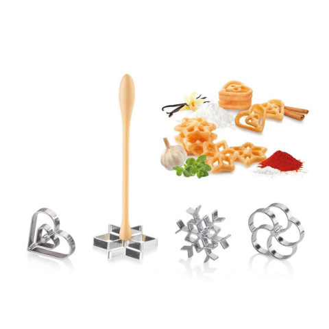 Kiválóan alkalmas rózsafánk, gofri rosette készítéséhez. A készlet 4 db pehely-, csillag-, szívecske- és virág alakú sütőformát, és 1 db hőálló markolatot tartalmaz.