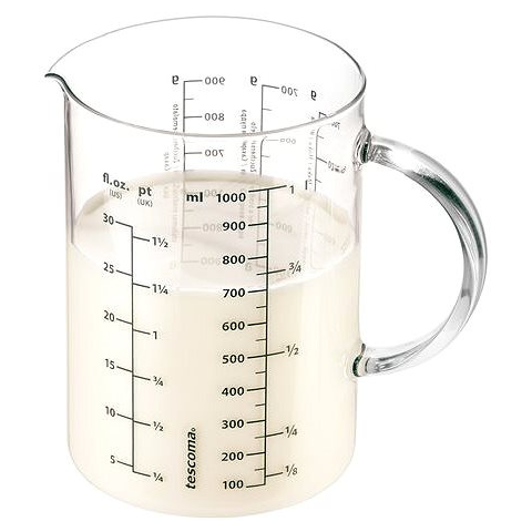 Mérőpohár - üveg, mért egységek ML, L, G, uncia és pint, teljes űrtartalma 1 l, fül a csomag része, ellenáll mosogatógépben mosásnak és melegítésnek mikrohullámú sütőben, magassága 15 cm, átlátszó kivitel A remek TESCOMA DELÍCIA üveg mérőpohár 1,0 l termék alapvető tulajdonságai A minőségi Tescoma konyhai mérőpohár tökéletes az összetevők kiméréséhez A megfelelő hozzávaló arányok alapvetőek a tökéletes
