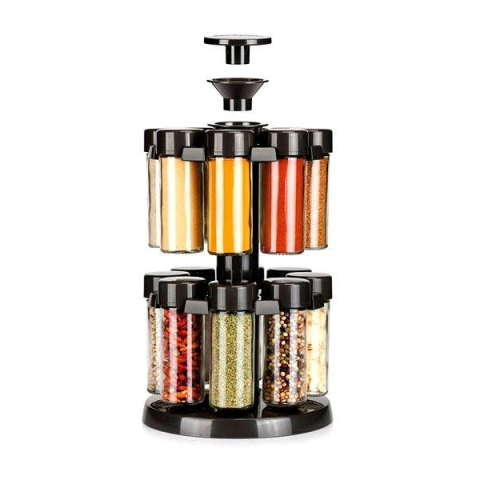 Fűszertartó szett - 16 db a készletben, forgatható, fedeles és mosogatógépben mosható, edény anyaga üveg, tárolóedény magassága 11 cm, fűszertartók, állvány és adagoló zacskós fűszerekhez a csomagban, polc/állvány magassága 28 cm Önnek is a fiókokban henyélnek a fűszeres zacskók és belefáradt a folyamatos keresgélésbe, hogy éppen melyikre van szüksége? A problémát megoldja ez a nagyszerű Tescoma készlet. 1