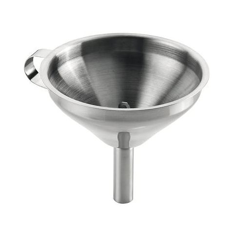 Konyhai tölcsér - kiváló italok és folyadékok áttöltésére keskeny nyakú palackokba, kivehető szűrővel, első osztályú rozsdamentes acélból With an all-stainless steel funnel, it will no longer be a problem for you to pour the drink into a bottle with a narrow neck. The 12 cm diameter Tescoma GrandCHEF funnel is equipped with a re