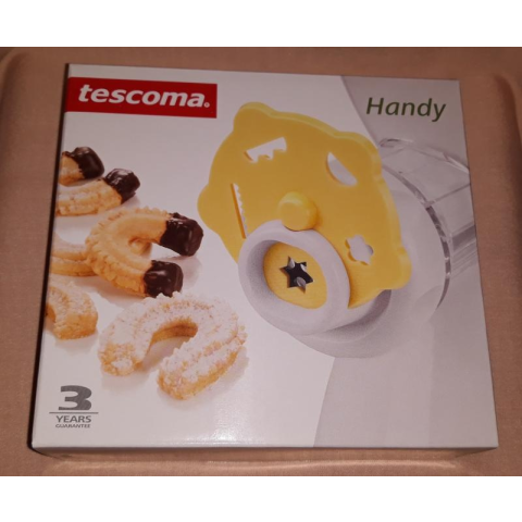 A dobozban a Tescoma Handy darálóval kompatibilis kiegészítő szett található, mely kétféle betétet tartalmaz: linzertészta/darálós keksz betét (több formaváltozatban gyártható házi linzer és darálós keksz, vaníliás keksz, stb.) illetve kolbásztöltő/hurkatöltő betétet. (Tescoma Handy daráló száma: 643586)