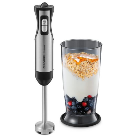 Botmixer - 800 W teljesítmény, 6 sebességfokozat, folyamatos sebességvezérlés a gomb nyomvatartásával és turbo sebesség, vágás és mixelés, maximális fordulatszáma 16000 ford/perc, keverőedény mellékelve, rozsdamentes acél keverőszár A hasznos Tescoma botmixer nem foglal sok helyet a konyhában, mégis könnyedén készíthetsz vele mártásokat, püréket, turmixokat vagy különféle krémleveseket. A sima működés érdekében 800 W teljesítmény