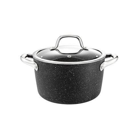 Fazék - alkalmas gáz, elektromos, indukciós és üvegkerámia főzőlaphoz, alakja kerek, 3 l-es kiszerelés, rozsdamentes acél fogantyúval, nem éles fémeszköz használatának lehetősége, tapadásmentes felület, sütőben használható és mosogatógépben mosható, mérete 18 × 27,5 cm (Ma×Sz), átmérője 20 cm, fedő is a csomag része, fekete színben