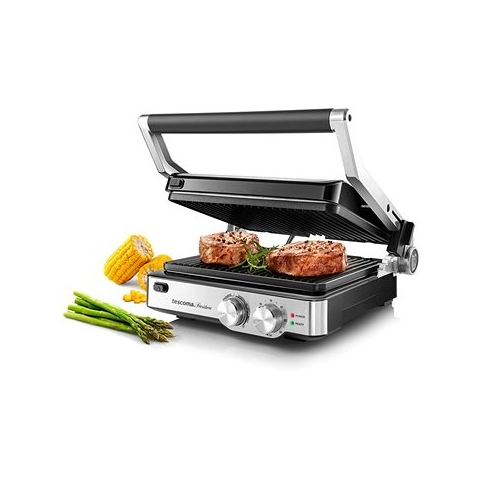 Kontakt grill - 2000 W teljesítmény, 2 db, grill anyaga: acél, időzítő, tapadásmentes felület, csepptálca és hőszabályzás, tömege: 4,4 kg A közismert Tescoma márka által tervezett elektromos grillsütő rendkívüli kulináris élményt nyújt. Az elektromos grillsütőváz anyaga: acél. A grill energiaigénye 2000 W. Összesen öt különböző pro