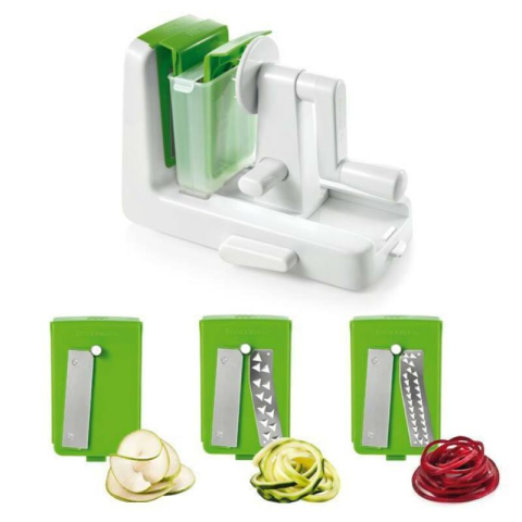 A Tescoma Handy spirálvágóval zöldségekből, gyümölcsökből percek alatt mutatós, vitaminokban és ásványi anyagokban gazdag ételeket varázsolhatunk asztalunkra. A kalóriadús, szénhidrátban gazdag tésztákat helyettesíthetjük cukkini spagettivel, zöldségtésztával. A spirálvágóval isteni salátákat, zöldségcsíkokat, pirított zöldségeket, valamint spirálszeleteket készíthetünk. Illesszük kedvenc gyümölcsünket vagy zöldségünket a spirálvágóba, forga