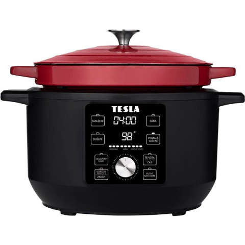 Multifunkciós főzőedény - választható funkciók gőzölés, sütés, olajban sütés és lassú főzés, űrtartalma 5,6 l, a felszerelés része kijelző, mosogatógépben mosható tartozékok, kivehető edény, termosztát, időzítő, hőmérséklet megtartása, automatikus kikapcsolás, hőmérséklet szabályozás és késleltetett indítás, 1500 W teljesítmény, gőzölő a csomag része, mérete 28 × 38 × 33 cm (Ma×Sz×H), tömege 7,9 kg, fekete és piros kivitel A TESLA MultiC