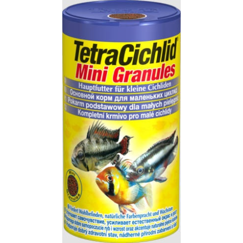 TetraCichlid Mini Granules - Az ideális választás kisebb cichlidek számára, kifejezetten tervezve a kempósállatok igényeinek kielégítésére. Gazdag fehérjetartalma és kiegyensúlyozott formulája biztosítja a halak optimális egészségét és élénk színét. A pré
