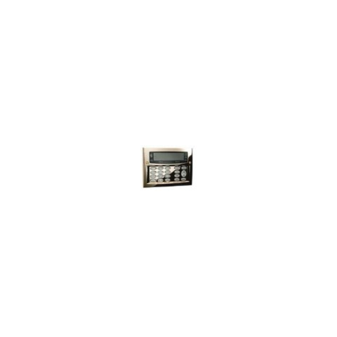 Nagy kijelzős, felületre szerelhető LCD kezelő, polírozott bronz színű fém előlap, beépített proximity olvasóval, 1 programozható kimenet, 2 zóna bemenet, 1 hangszóró kimenet, kék LCD kijelző, EN 50131 Class 3