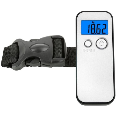 Bőröndmérleg - poggyászhoz, nagyméretű, háttérvilágítású kijelzővel, kompakt és igen könnyű, ideális repülőgépekben, automatikus kikapcsolás, terhelhetőség 40 kg, 10 g-os felbontás, 1x CR2032 (tartalmazza) nevyplňovat