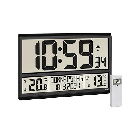 Falióra - digitális, elemes tápellátás, a működtetéséhez szükséges 4 × ceruza (AA) elem, vezeték nélküli érzékelő, DCF-77 rádiójelzés által irányított idő, nap a héten, naptár, LED kijelző, szundi, hőmérő és külső és belső hőmérséklet megjelenítése, méretek 23,5 × 36 × 2,8 cm (H×Sz×Mé), tömege 951 g Az elegáns TFA falióra remekül kiegészítheti az otthonodat. A tervezésének köszönhetően szépen illeszkedik majd a konyhába. Ez az adott fal