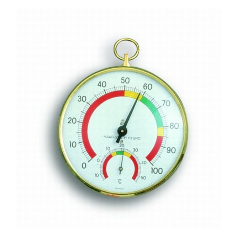 Analóg hő- és páratartalommérő Szintetikus szállal Mérési tartomány:-10°+55°C,0-100% Méret:100mm Pontosság:+1°C, +5%