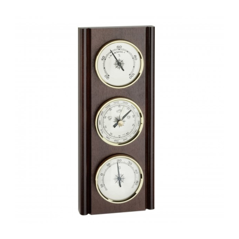 Barométer kombináció (légynyomásmérő, hőmérő és páratartalommérő) Barna színű hátlap Teljes mérete:270x110mm Műszerek átmérője:70mm