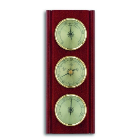 Barométer kombináció (légynyomásmérő, hőmérő és páratartalommérő) Mahagóni színű hátlap Teljes mérete:270x110mm Műszerek átmérője:70mm