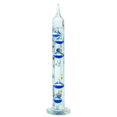 Galilei hőmérő 28cm kék Szobai használatra, golyók száma:5, aranyozott plomba. Hőmérsékleti tartomány:+18°+26°C Osztás:2°C Hossz:28cm átmérő:34mm
