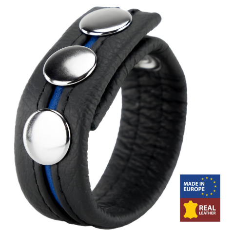 Fedezd fel a vágy intenzív birodalmát a prémium bőrből készült péniszgyűrűnkkel! A 22 mm szélességű, elegáns design a tökéletes erő és kényelem ötvözete, míg a középső kék vonal még vonzóbbá teszi. A három fém patent lehetővé teszi a testreszabást, így a