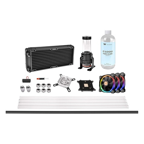 The Pacific M240 D5 Hard Tube Water Cooling Kit is an efficient, yet quality liquid cooling solution for all watercooled gaming systems. Inside you will find a W3 CPU waterblock, PR15-D5 pump/reservoir combo, R240 radiator, C1000 Pure Clear coolant, 3 Riing 12 RGB fans, 6 C-Pro compression fittings, 2 adapter fittings, 4 PETG hard tubes and other accessories.