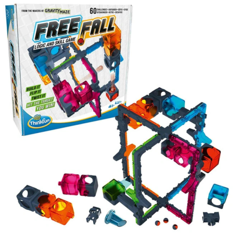 Thinkfun Free Fall-Szabadesés Ajánlott 8-99 éves korig unisex [Cikkszám 05951]A ThinkFun logikai-oktató társasjátéka, a Free Fall, izgalmas kihívásokat kínál, amelyek során a játékosok a gravitáció és téri tudatosság határait feszegethetik. A játék célja, hogy a labdát szakszerűen irányítsuk a különböző alagutakon keresztül, kihasználva a gravitáció erejét. A Free Fall 60 feladatot tartalmaz, amelyek a kezdőtől a haladó szintig terjednek, így minden kor