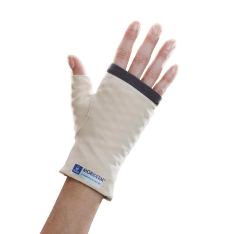 A Mobiderm méretsorozatos ujjatlan kesztyű egy speciálisan kialakított, nem kompressziós, de ödéma-csökkentő hatású kézvédő, amelyet a felső végtag nyiroködémájának fenntartó kezelésére fejlesztettek ki. A termék belsejében elhelyezett Mobiderm® technológia segíti a nyirokfolyadék mobilizálását, miközben kényelmes viseletet biztosít akár éjszakai használatra is. A