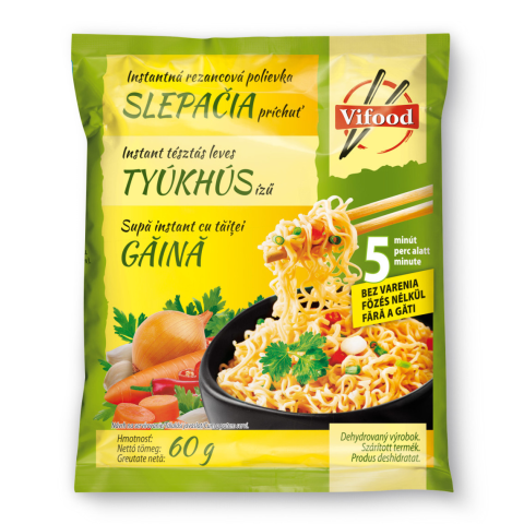 Thymos vifood instant leves tyúkhús ízű 60 g Összetevők: Instant tészta (92%): búzaliszt, pálmaolaj, antioxidáns (E321), étkezési só, savanyúságot szabályozó anyagok (E500, E501, E452), sűrítő anyag (E412), színezék (E101), Fűszerkeverék (8%): étkezési