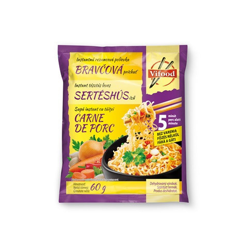 Thymos vifood instant leves sertéshús ízű 60 g Összetétel: Instant tészta (92%): búzaliszt, pálmaolaj, antioxidáns (E321), étkezési só, savanyúságot szabályozó anyagok (E500, E501, E452), sűrítő anyag (E412), színezék (E101), Fűszerkeverék (8%): étkezé