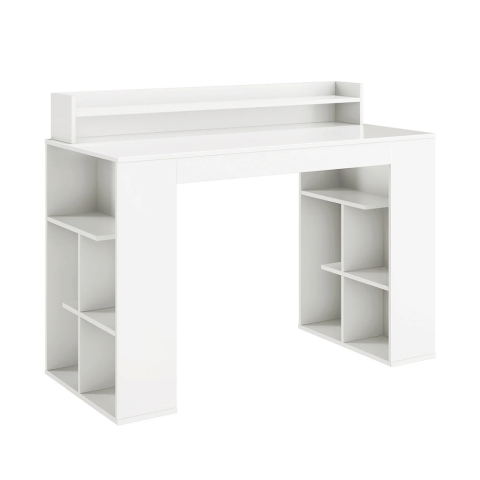 Ez a modern, fehér íróasztal ideális választás otthoni irodába vagy tanulószobába. A megemelt monitorpolc segíti az ergonomikus testtartást, míg a két oldalsó, 3 szintes könyvespolc bőséges tárolóhelyet kínál dokumentumoknak, könyveknek és kiegészítőknek.