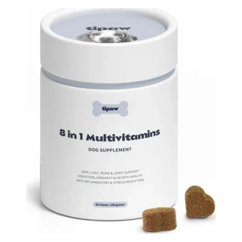 Tipaw 8-in-1 Multivitamins – 60 darabos, ízletes, puha falatkák formájában kapható komplex multivitamin kutyák számára. Támogatja az immunrendszert, az ízületeket, a bőrt és a szőrt, az emésztést és a vitalitást – minden fontos tápanyag egy helyen! A
