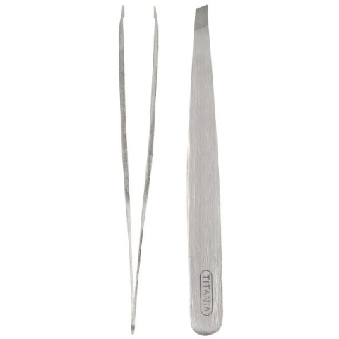 Csipesz - ferde végű kialakítás, 9,5 cm hosszúságú, ezüst színben A finom TITANIA PROFI szemöldökcsipesz egy 2 az 1-ben darab. A csipesz vége ferde. A rozsdamentes acél anyag INOX jelölést visel. A minőségi és kidolgozott TITANIA PROFI szemöldökcsipesz minde