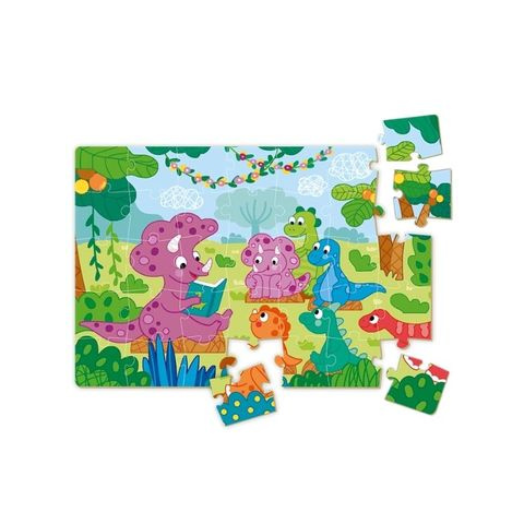 35 darabos, vibrálóan színes, vidám dinoszauruszokat ábrázoló kirakó. A darabok tökéletesen illeszkednek egymáshoz.A kirakott kép mérete: 20 x 13 cm